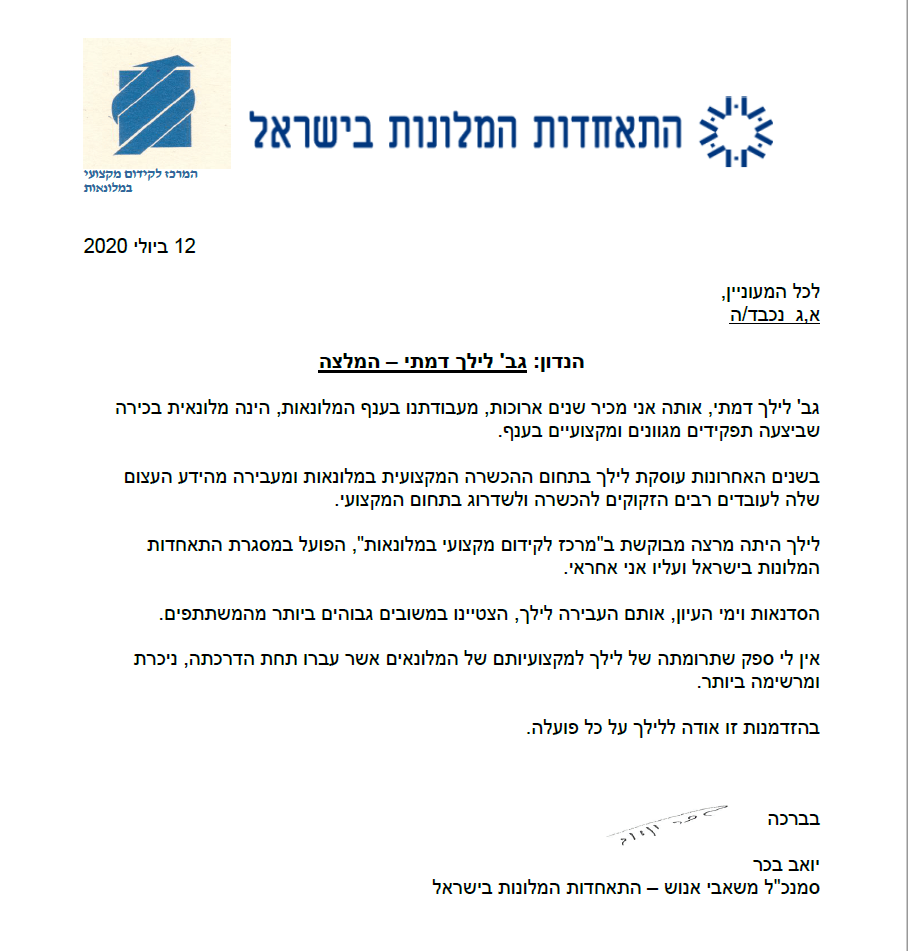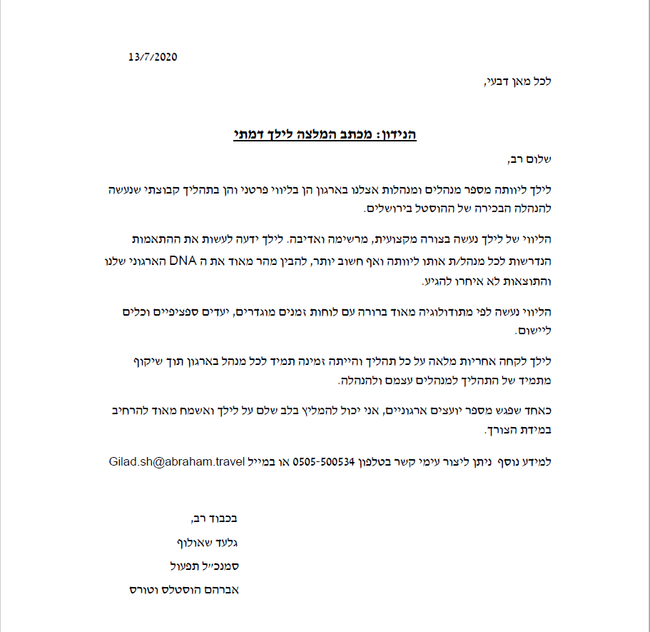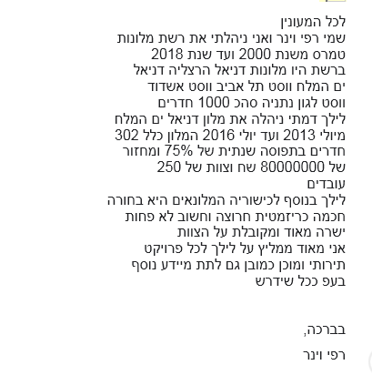 - הישגים מוכחים בניהול עסקי רווחי, העלאת תפוסות והקפי פעילות, שביעות רצון לקוחות ועוד.