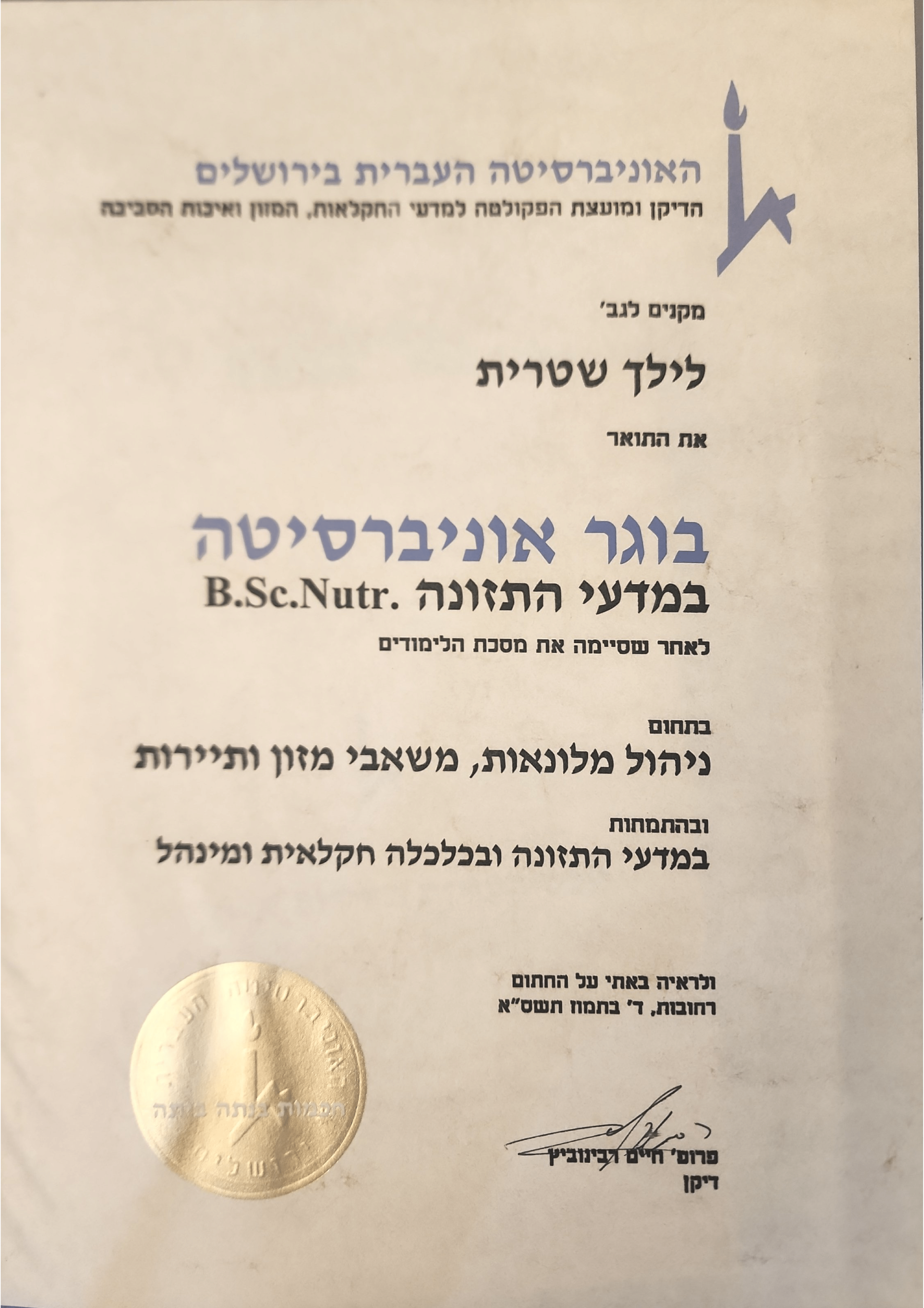 - השכלה אקדמאית בתחום, תואר B.Sc בתזונה התמחות בניהול מלונאות משאבי מזון ותיירות.